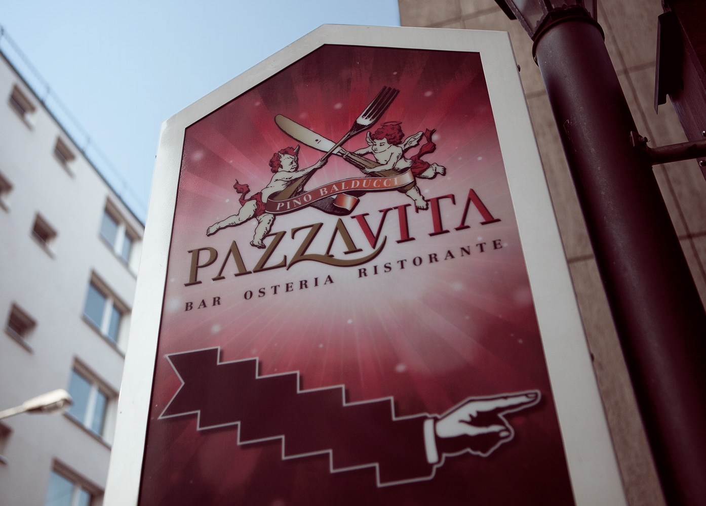 Dem verrückten Leben (Pazza Vita) ein Zeichen gesetzt. Das italiensche Restaurant, mit hochwertiger Küche ist ein Ort zwischen absurden Begegnungen, und Genuss-Kultur. Die Marke wird dem mehr als Gerecht, und steht in Anlehnung an die traditionelle italienische Malerei und der Symbolik zwischen Himmel und Hölle. So wird schon das Eintreten durch eine Art Himmelspforte zum unbewussten Markenerlebnis.
